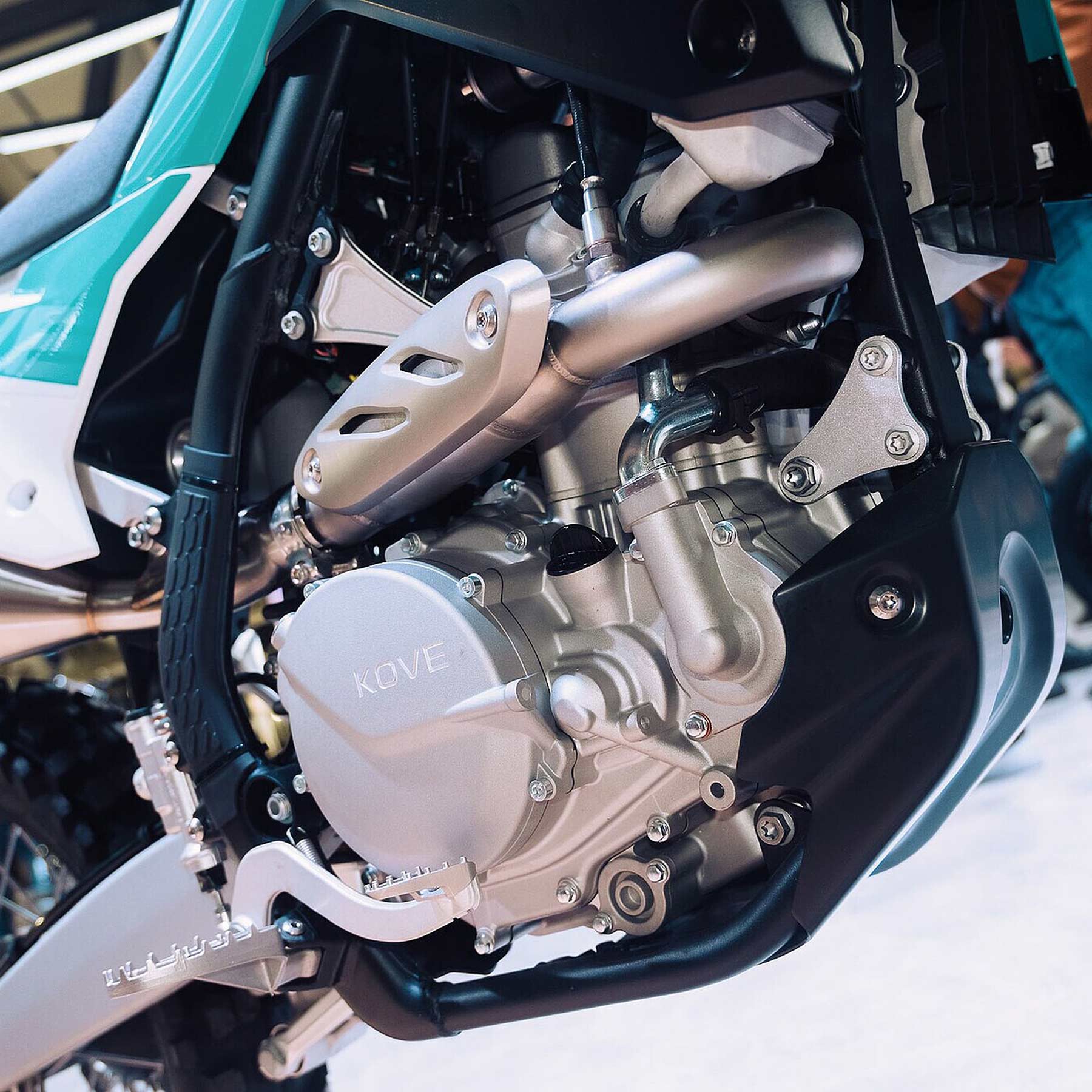 Der Motor der KOVE 450 Enduro sei ein komplett neu entwickelter 450-ccm-Einzylinder, der laut Hersteller aus einem intensiven Testprogramm im Rahmen der Rallye Dakar hervorgegangen sei. Der wassergekühlte Viertakter leiste 35 kW (47,6 PS) bei 9.500 U/min und biete ein Drehmoment von 40 Nm bei 7.500 U/min. Mit einer Verdichtung von 13:1 und der BOSCH-Einspritzung sei der Eintopf auf präzise Gasannahme und gleichmäßige Leistungsabgabe ausgelegt.