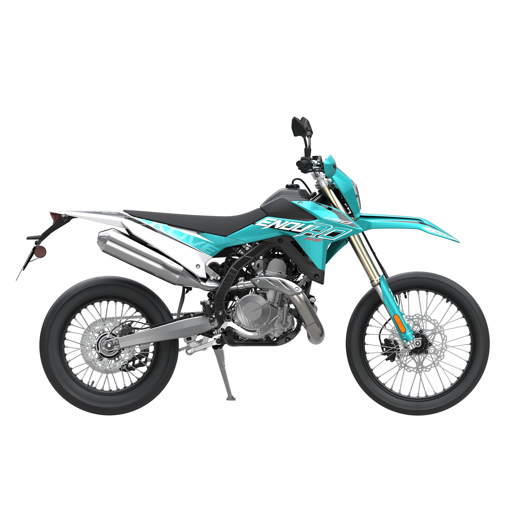 Gebremst wird mit Komponenten von Taisko: vorne eine Einzelscheibe mit Doppelkolben-Schwimmsattel, hinten eine Scheibe mit Einkolbensattel. Für zusätzliche Sicherheit ist ein Dual-ABS-System an Bord, das beide Räder überwacht. Auch bei der Beleuchtung zeigt sich die 450 Enduro modern: Voll-LED-Scheinwerfer, Tagfahrlicht, LED-Blinker und ein LCD-Cockpit gehören zur Serienausstattung. Die Energieversorgung übernimmt eine leichte 2,3-Ah-Lithiumbatterie.