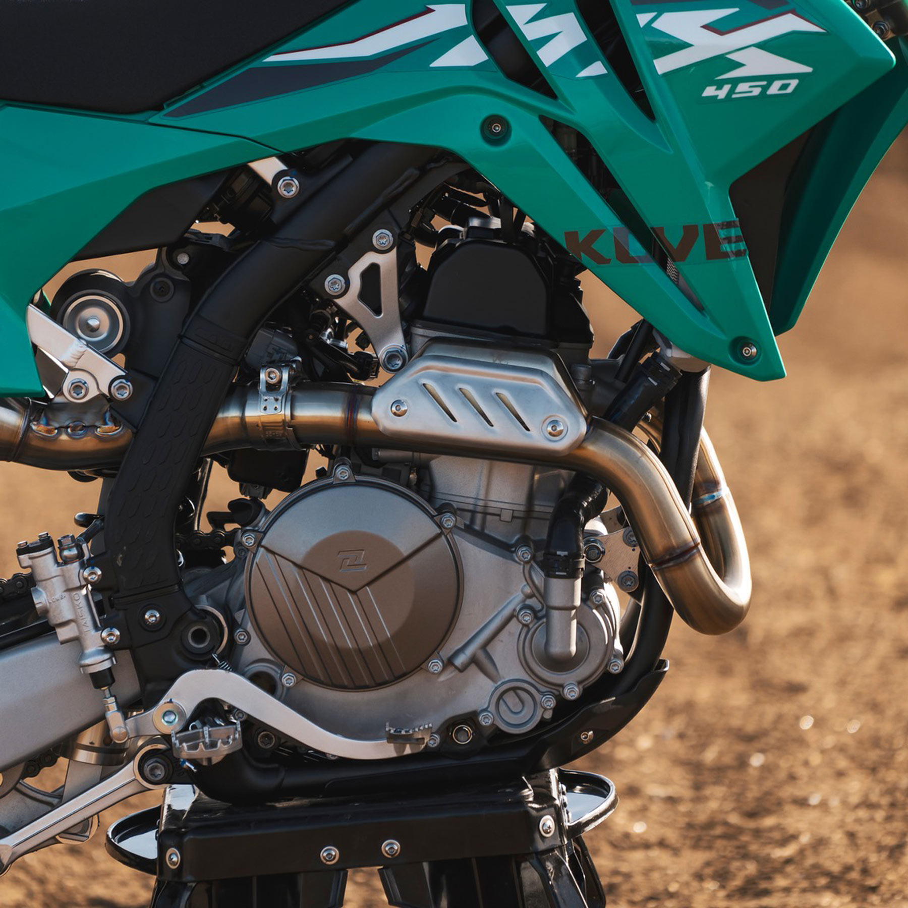 Die Bremskraft kommt von einer schwimmend gelagerten Vorderradbremsscheibe mit 2-Kolben-Bremssattel und einer Hinterradbremsscheibe mit 1-Kolben-Bremssattel, die für sanftes, kontrollierbares Bremsen sorgt. Montiert auf einem 90/90-21-Vorderreifen und einem 110/90-19-Hinterreifen, sorgen der 38,5°-Lenkwinkel und der 28°-Vorlauf des MX450 für messerscharfes Handling und sofortiges Einlenken auf engen Trails und bei rasanten Fahrten gleichermaßen.